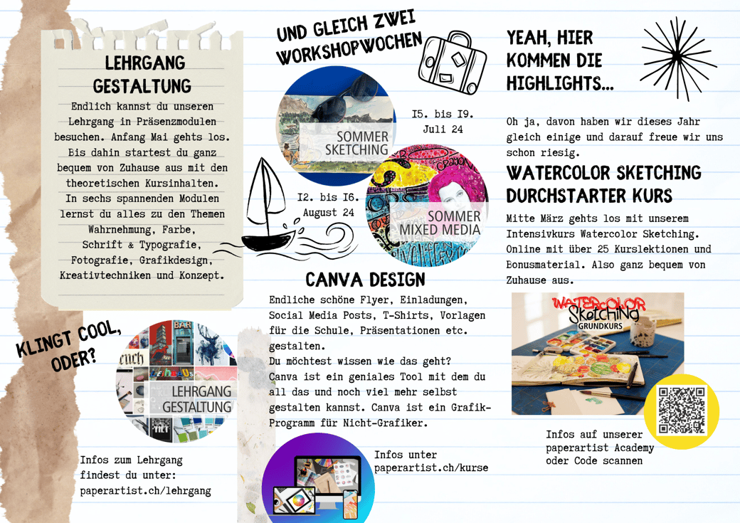 Hier sind unsere Kurshighlights für dieses Jahr - alles auf einen Blick. Wenn du unsere Highlights im im Auge behlaten willst, kannst du dir den Flyer auch als PDF runterladen. Ganz unten auf der Seite findest du den Download.